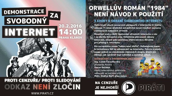 V reakci na několik událostí z posledních měsíců souvisejících s omezením svobody ve virtuálním světě pořádá Česká pirátská strana demonstraci za zachování svobodného Internetu, která se odehraje 20. února na pražském Klárově. V rámci manifestu vysvětlujícího konání akce upozornili Piráti na tři hlavní hrozby.