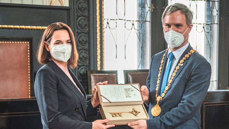 Pevně věřím, že obdivuhodné úsilí Vás, Vašich kolegů a všech běloruských občanů, kteří bojují za svobodu, dovede Bělorusko do stavu, kdy celá země bude založena na právním státě, demokracii a dodržování lidských práv. Toto jsou klíčové hodnoty i pro naše město. Jsou to hodnoty křehké a je nutné o ně neustále pečovat a připomínat si jejich význam. Vaše nasazení a odvaha v jejich hájení je proto tím nejsilnějším vzorem i pro Prahu.