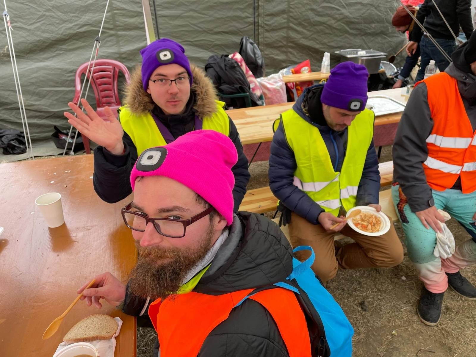 V čem spočívala Tvá práce?<br /> Přijeli jsme přesně na ranní meeting skautů, dostali jsme čepice s čelovkami, vysílačky a instrukce. Měli jsme na starost červené hasičské stany, kde odpočívali nebo přespávali uprchlíci čekající na další transit. Přes den bylo pět stupňů nad nulou, v Užhorodu čekali i osm hodin a byli zmrzlí. Organizace jako Člověk v tísni, Maltézští rytíři apod. zajišťovaly občerstvení i distribuci hygienických potřeb a oblečení. My tam byli v době, kdy už to bylo nějakým způsobem organizované, kdy už si to sedalo.